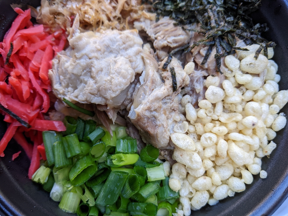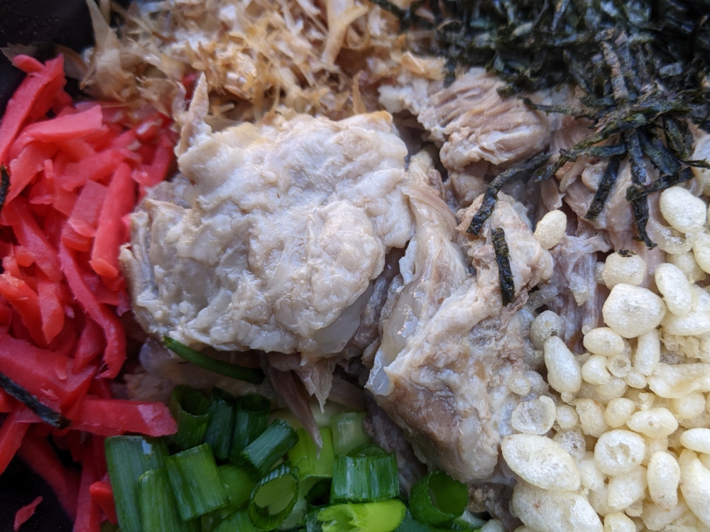 よく混ぜてとのことで勢いよく混ぜたら、揚げ玉が氾濫する盛りの良さ。